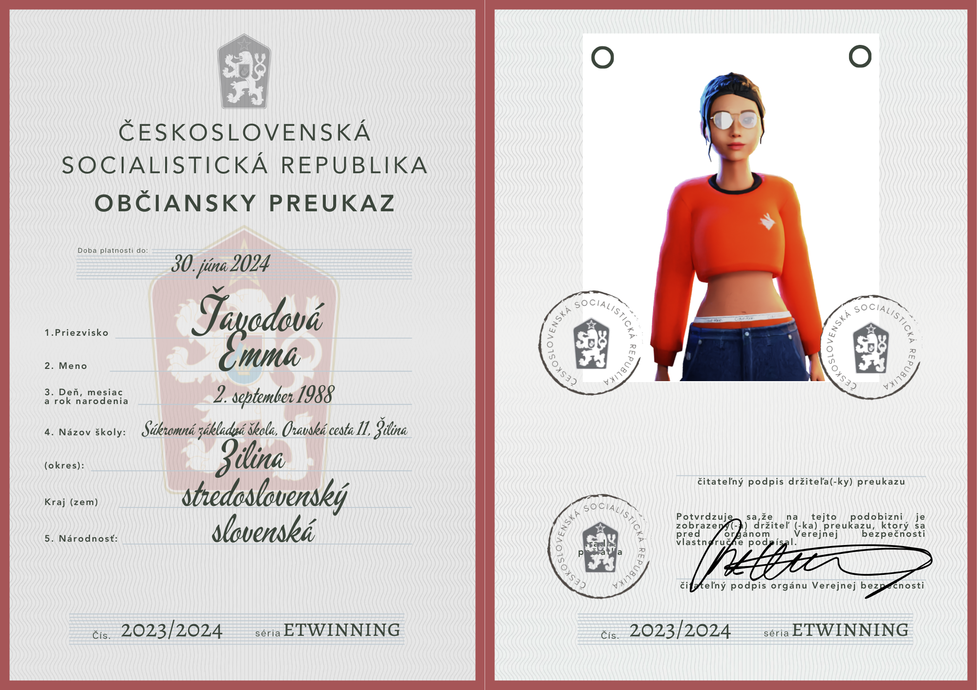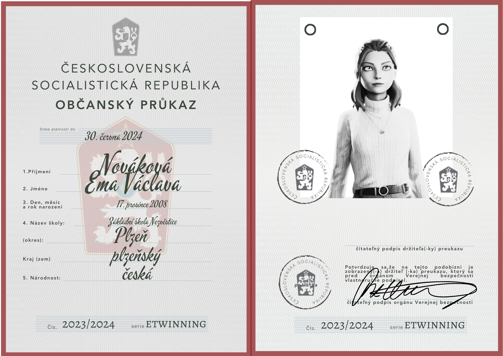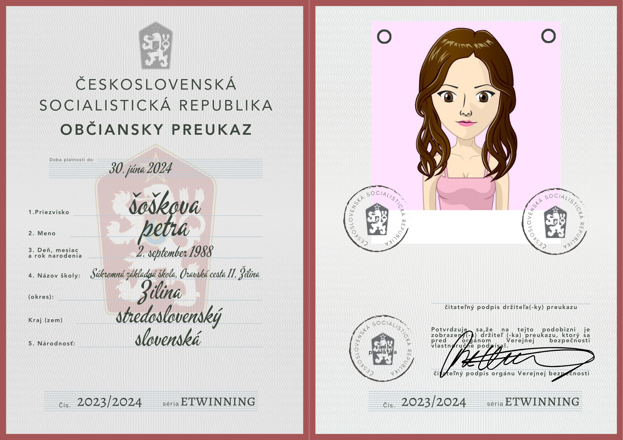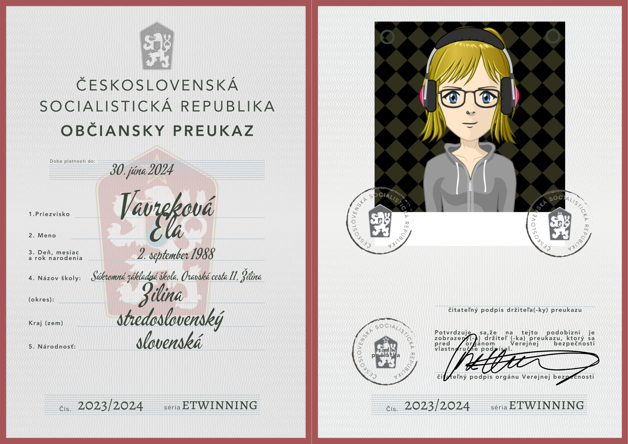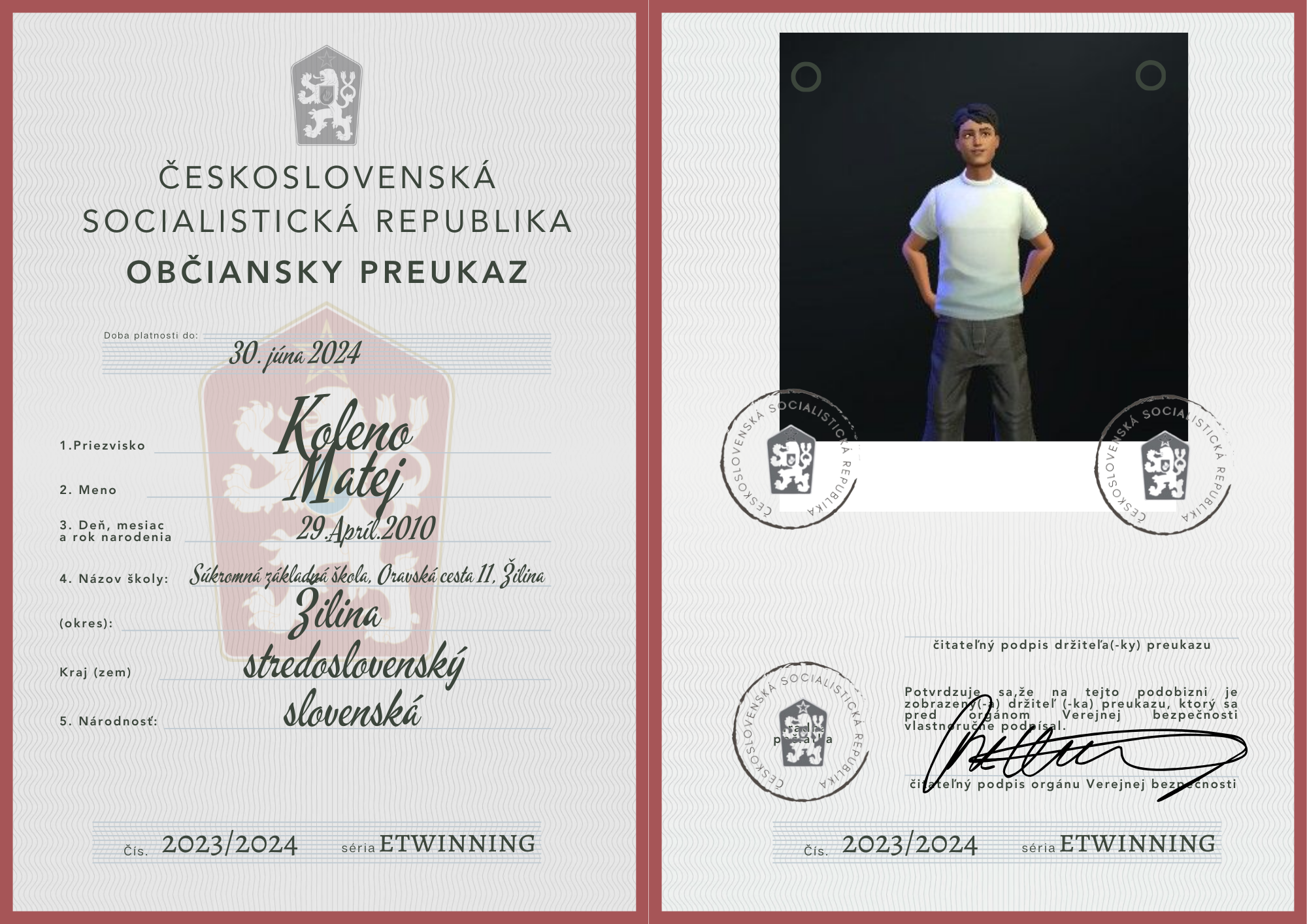 eTwinning projekt s našimi českými partnermi sa nám krásne rozbehol. Okrem toho, že sme už zrealizovali 2 online stretnutia, stihli sme okrem avatarov, grafiky k nášmu projektu (logá), hlasovania, interaktívnej manifestácie vyrobiť aj typické československé občianske preukazy.