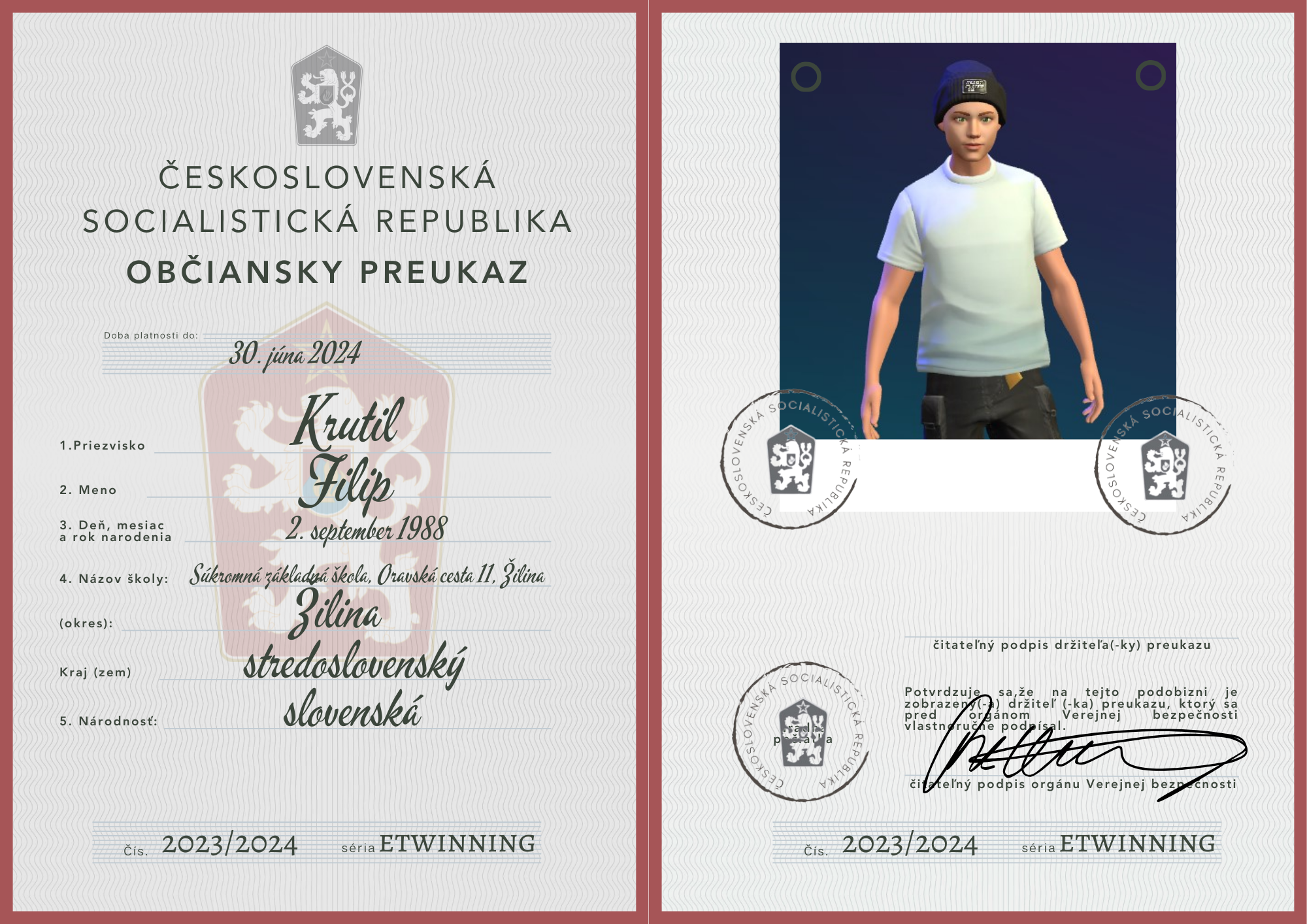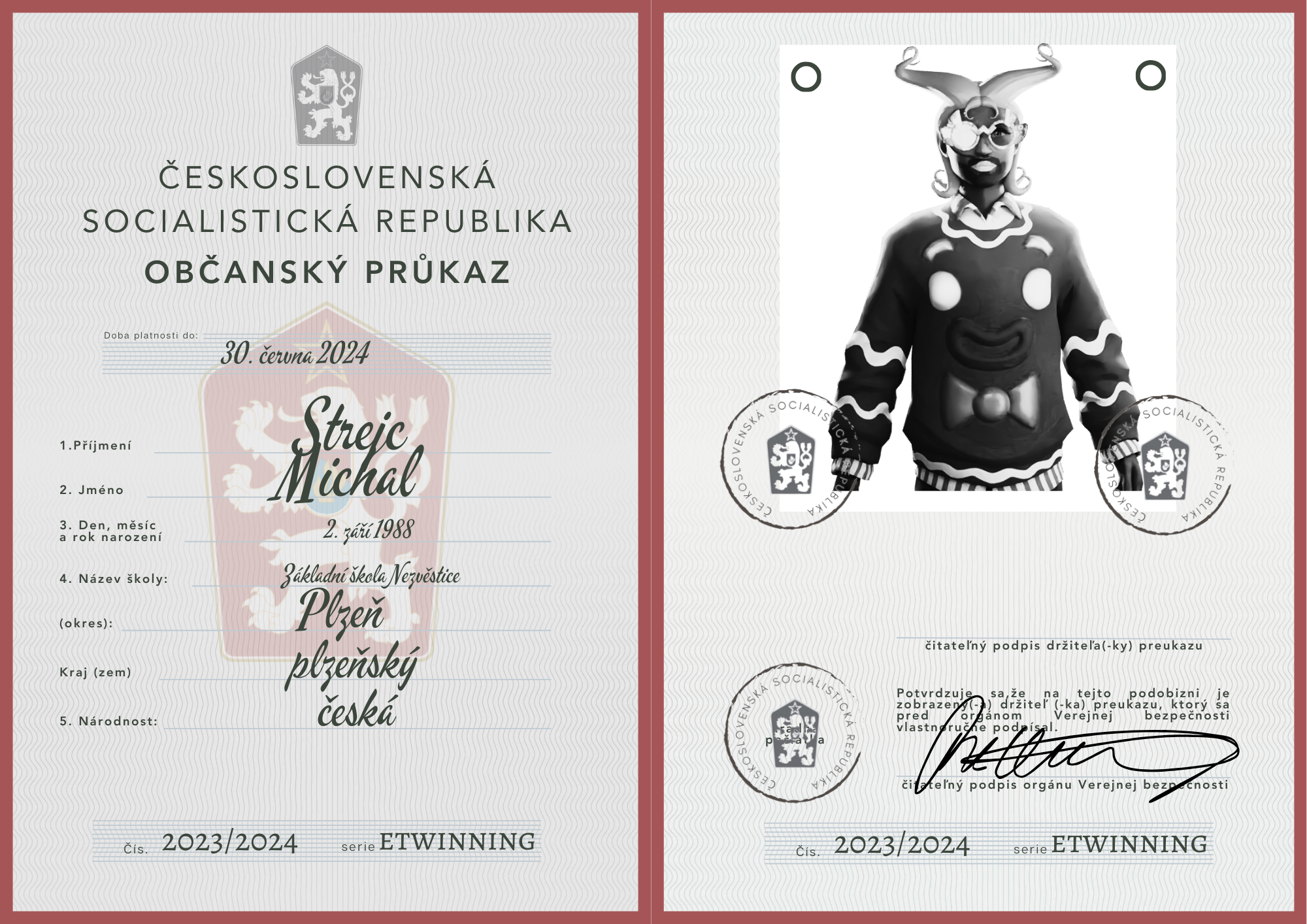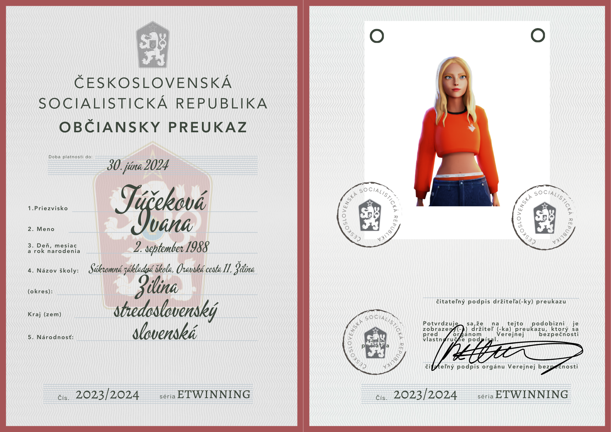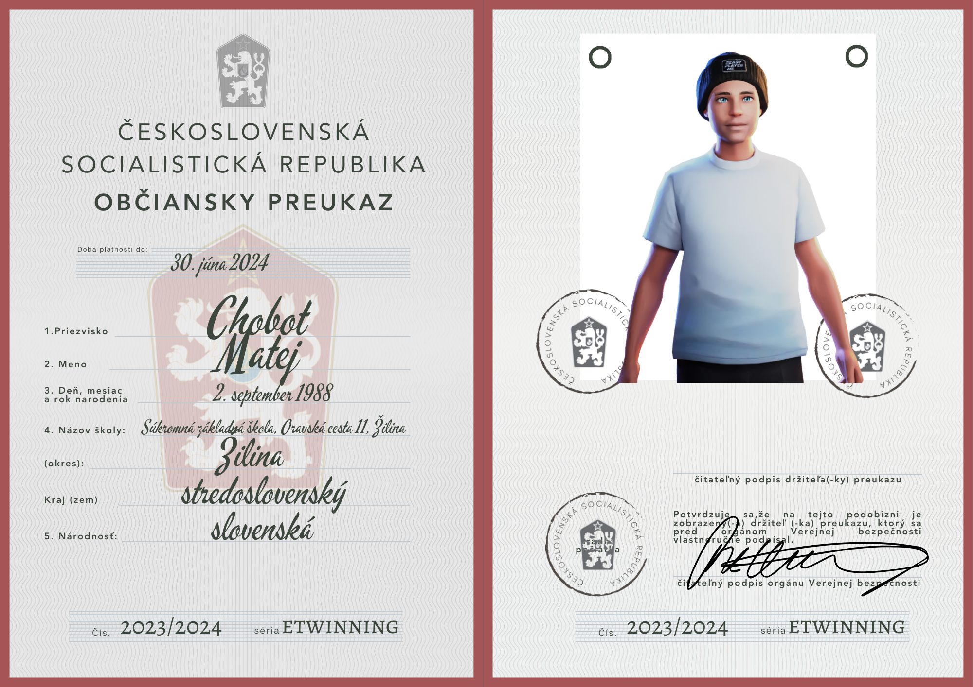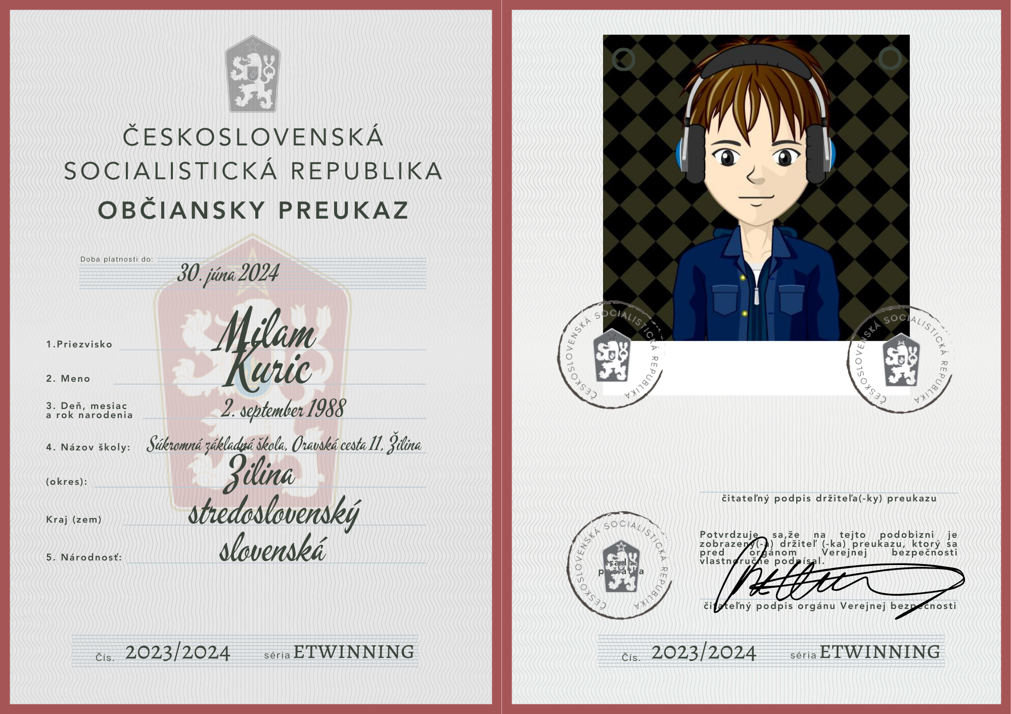 eTwinning projekt s našimi českými partnermi sa nám krásne rozbehol. Okrem toho, že sme už zrealizovali 2 online stretnutia, stihli sme okrem avatarov, grafiky k nášmu projektu (logá), hlasovania, interaktívnej manifestácie vyrobiť aj typické československé občianske preukazy.
