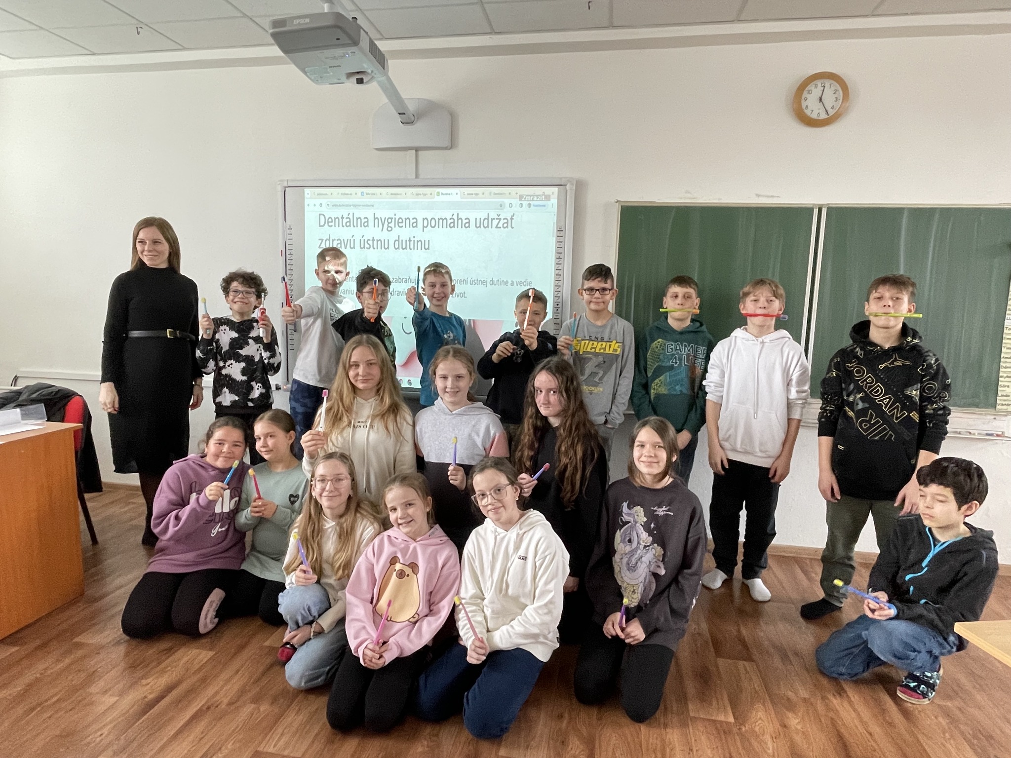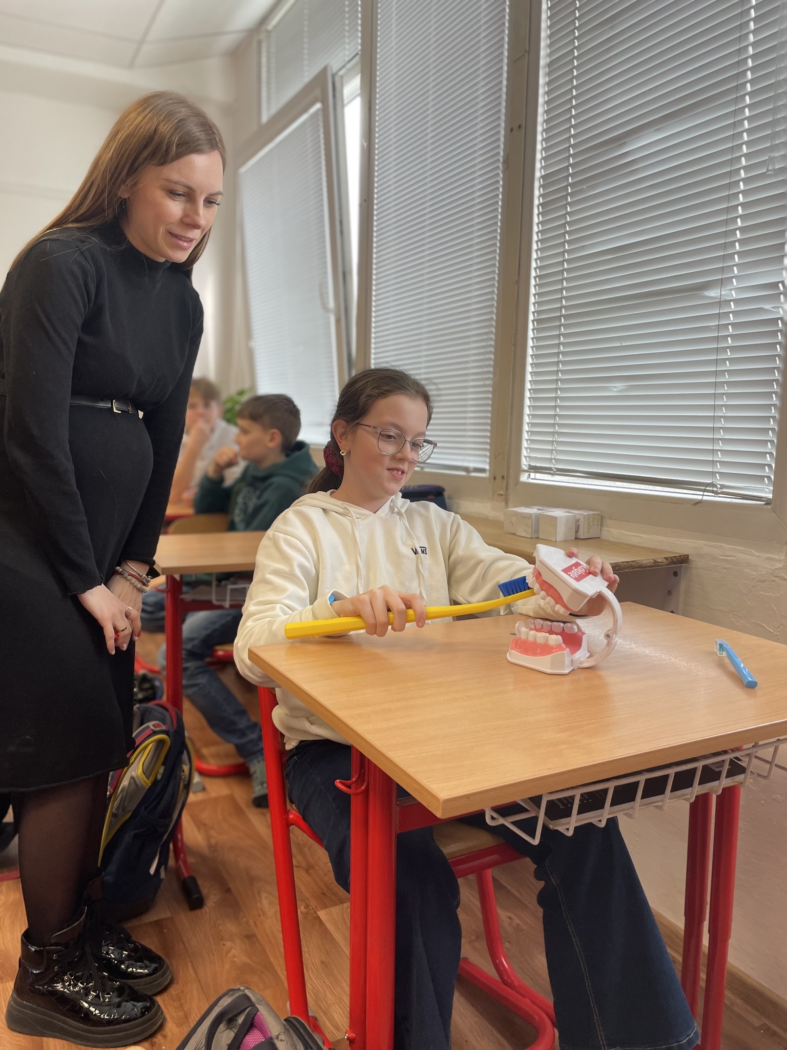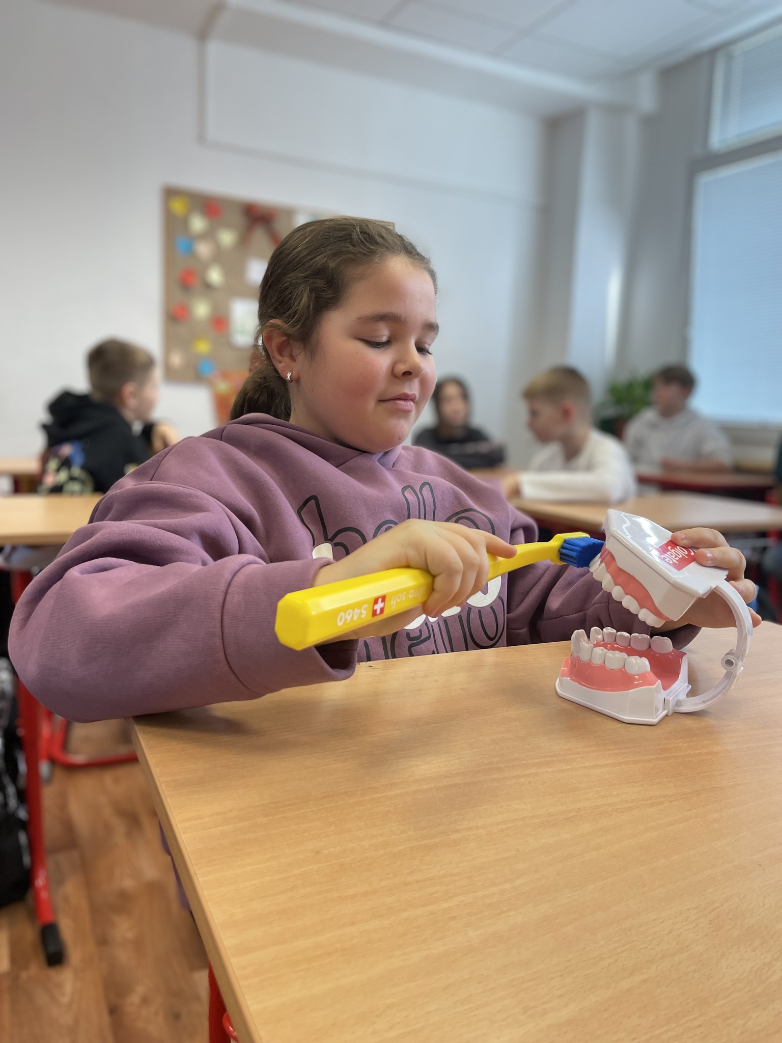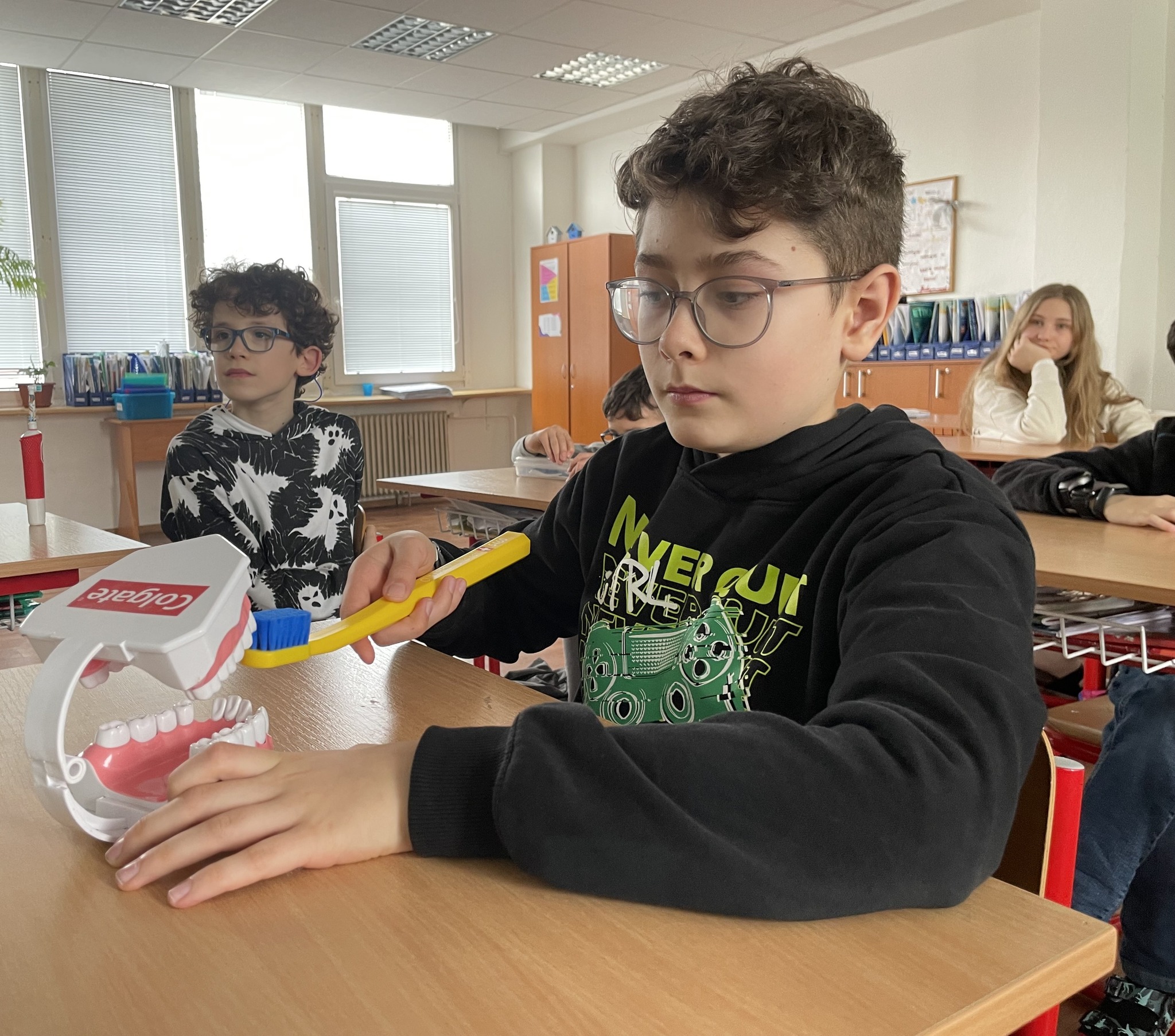 At today’s talk on “Children’s teeth and dental hygiene”, V.FA pupils learned about how to choose the right toothbrush and when to change it. Through various practical exercises, they learned the basic techniques of proper brushing and explained when and why to use a single-bristle toothbrush, dental floss and interdental brushes. The pupils took away a lot of useful information, a new toothbrush and a smile on their face.