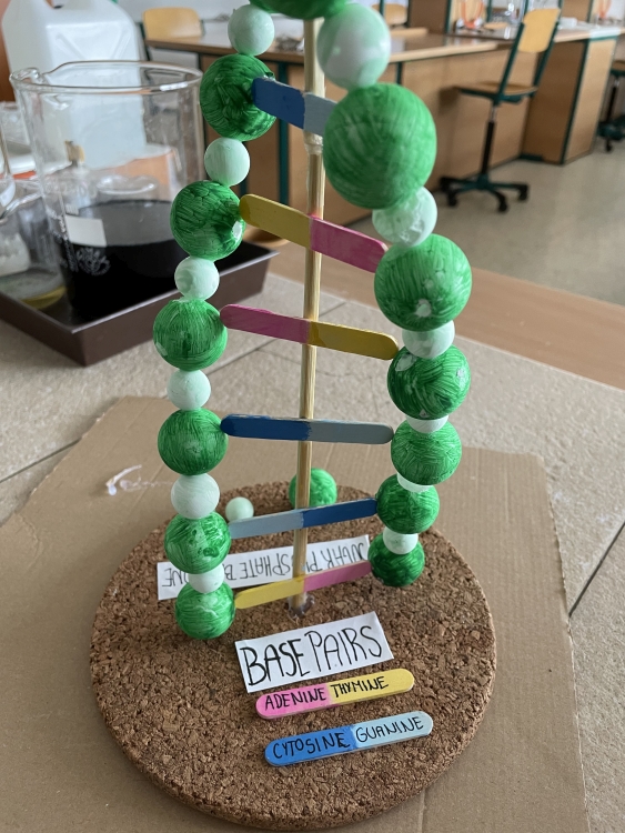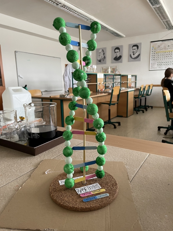 In biology lessons, together with eighth and ninth graders, we looked into the world of our DNA. We observed its structure and decided to apply our observations in our project work. The creation was also included in the competition organized by the Institute of Molecular Biomedicine of the Faculty of Medicine of Comenius University. The student of VIII.EA class, Rebecca Matušová, managed to visualize DNA in the form of a 3 D model really well. In this way pupils can actively prepare for their future profession. Judge for yourself. Thank you and fingers crossed for the evaluation of the competition.