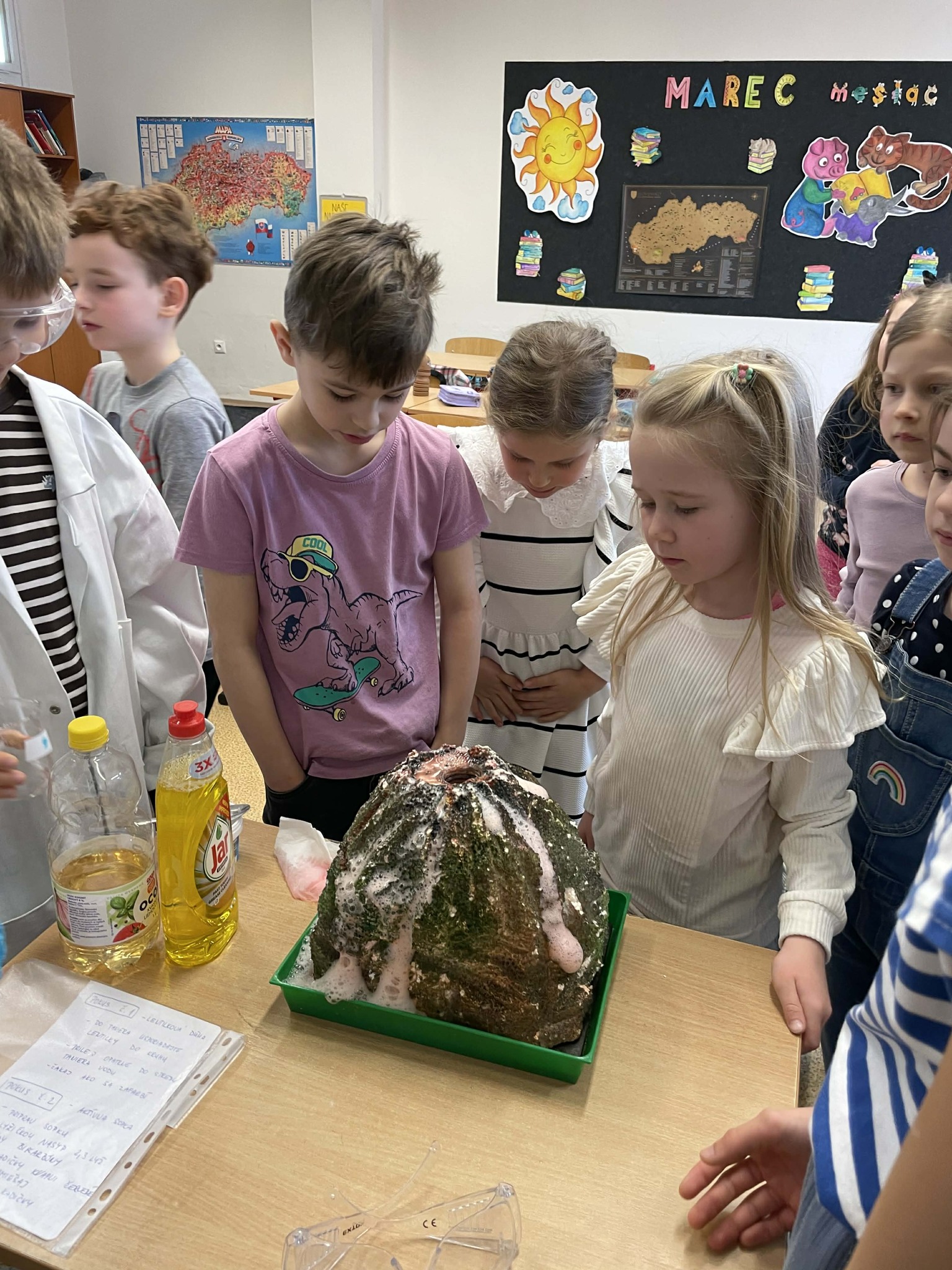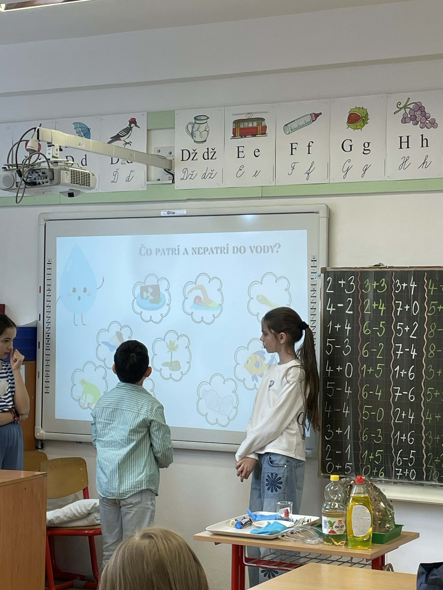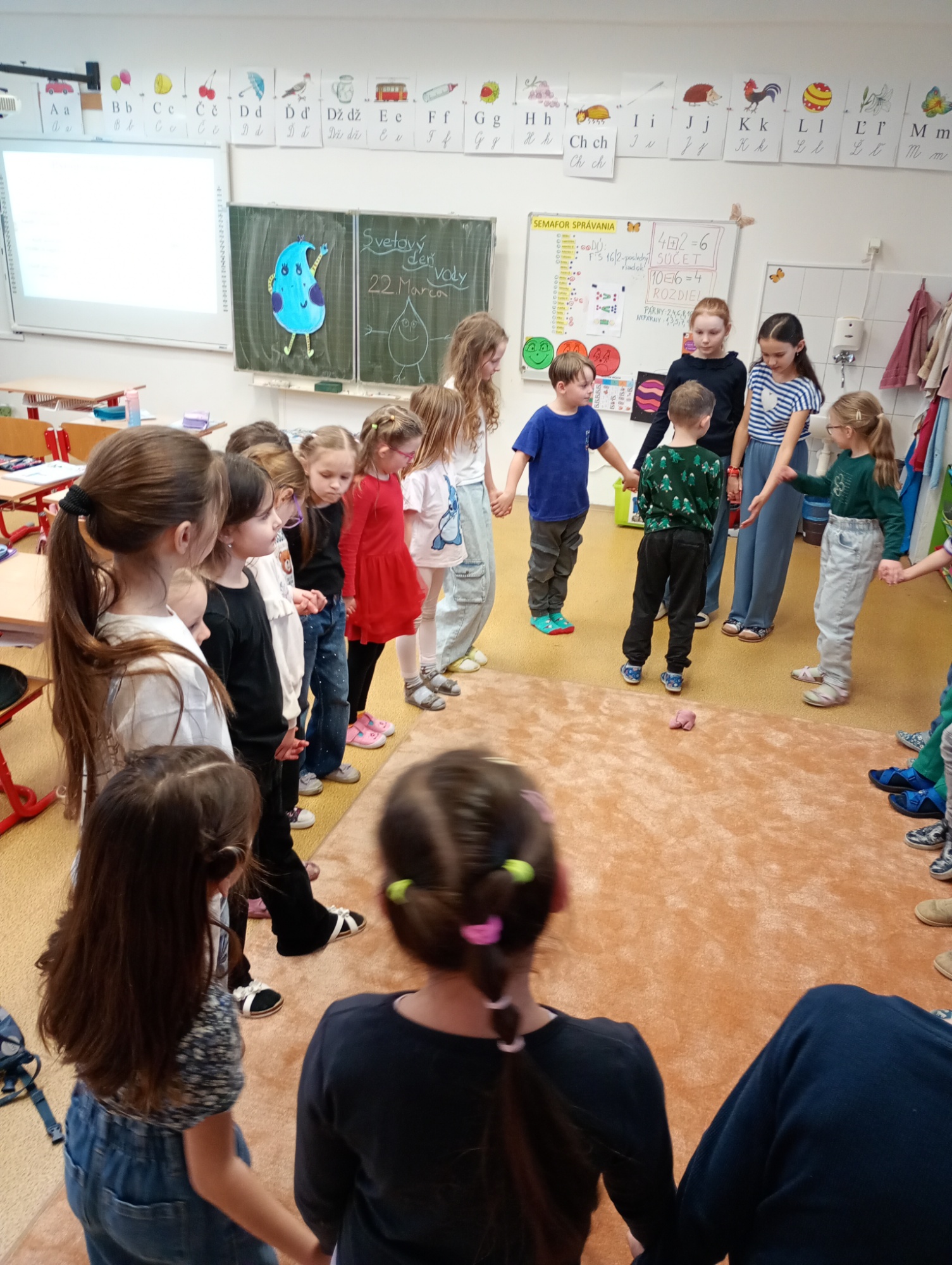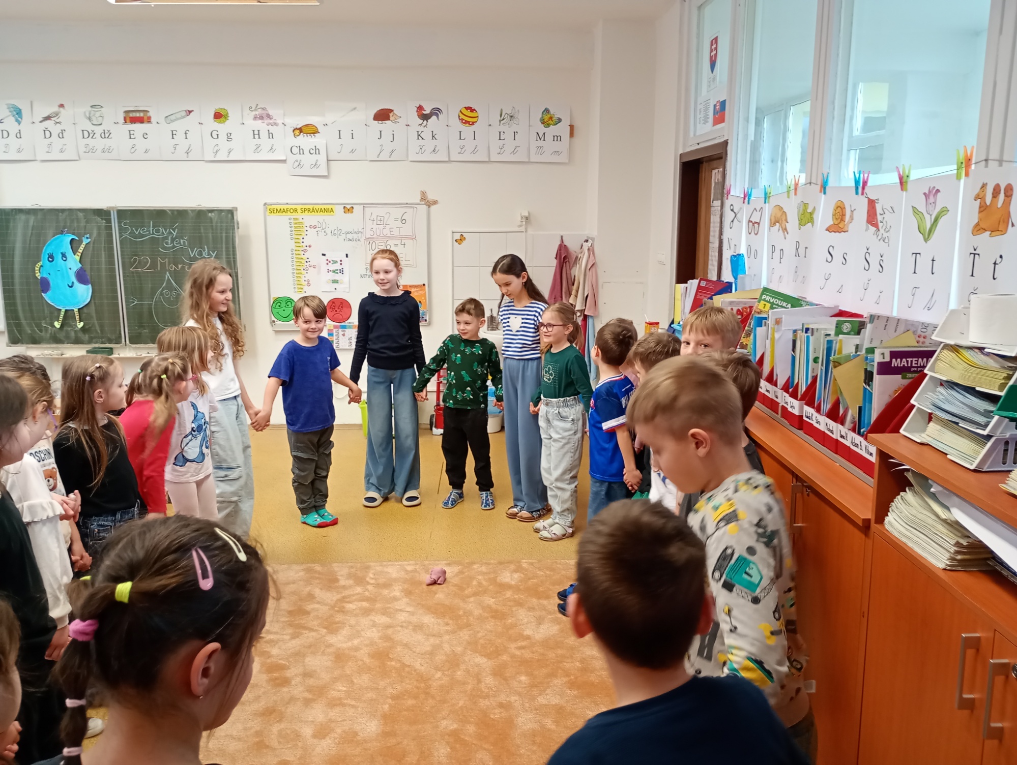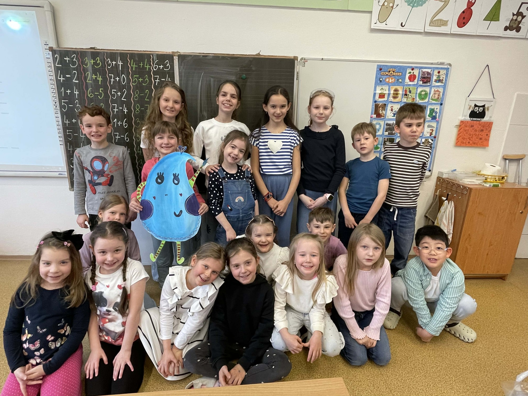 Today was dedicated to the topic of water for our first graders. On the occasion of the upcoming World Water Day, which is commemorated on 22 March, the older pupils from Year 5 – Zoe, Louisa, Gretka and Adelka – prepared an interesting peer education about the importance of water in our lives. During the meeting they asked a lot of questions – what is water important for, where we need it everywhere and also what belongs and what doesn’t belong in water. Together they also watched a short video about the water cycle in nature. In addition, they also prepared fun experiments which were very interesting for all of them – we saw an active volcano, a colourful rainbow made of ribbons and the formation of bubbles.