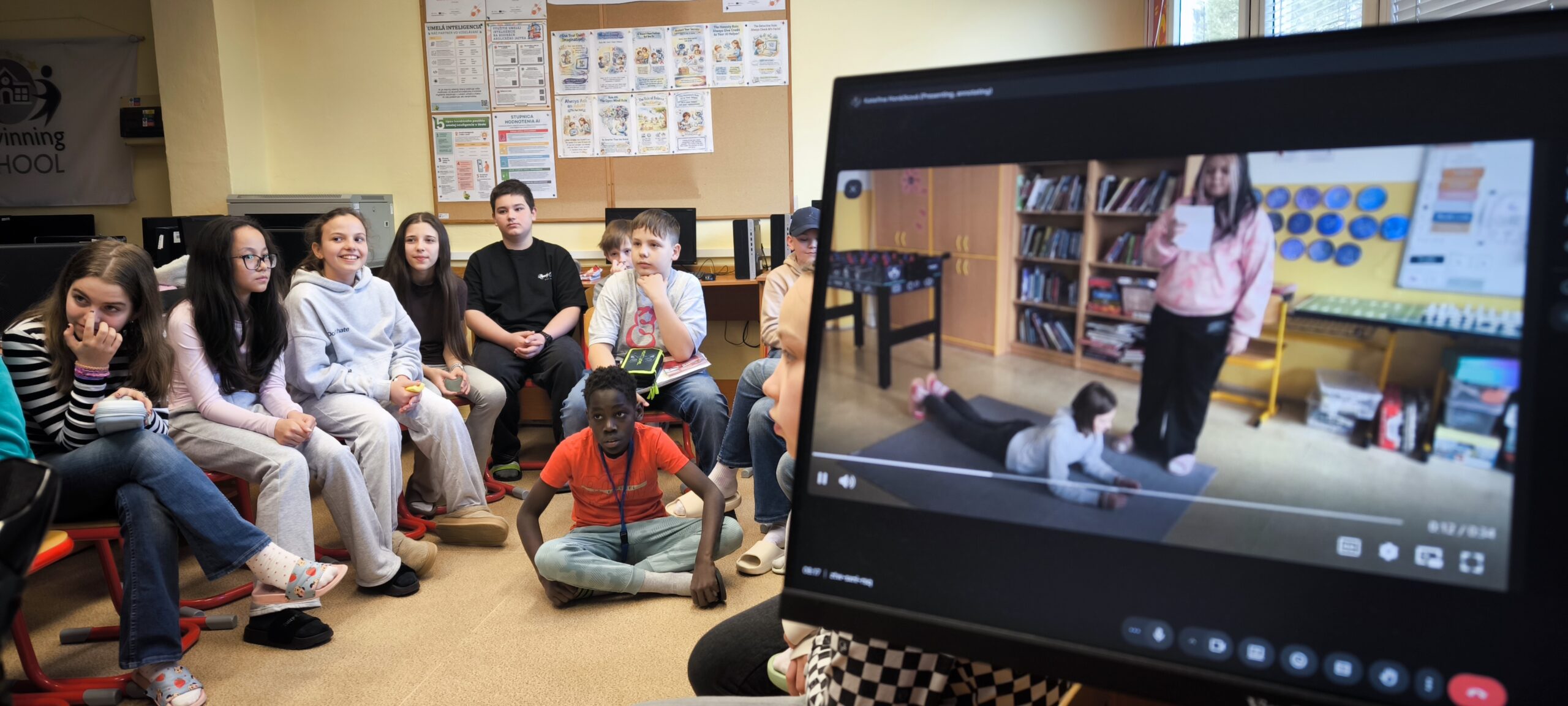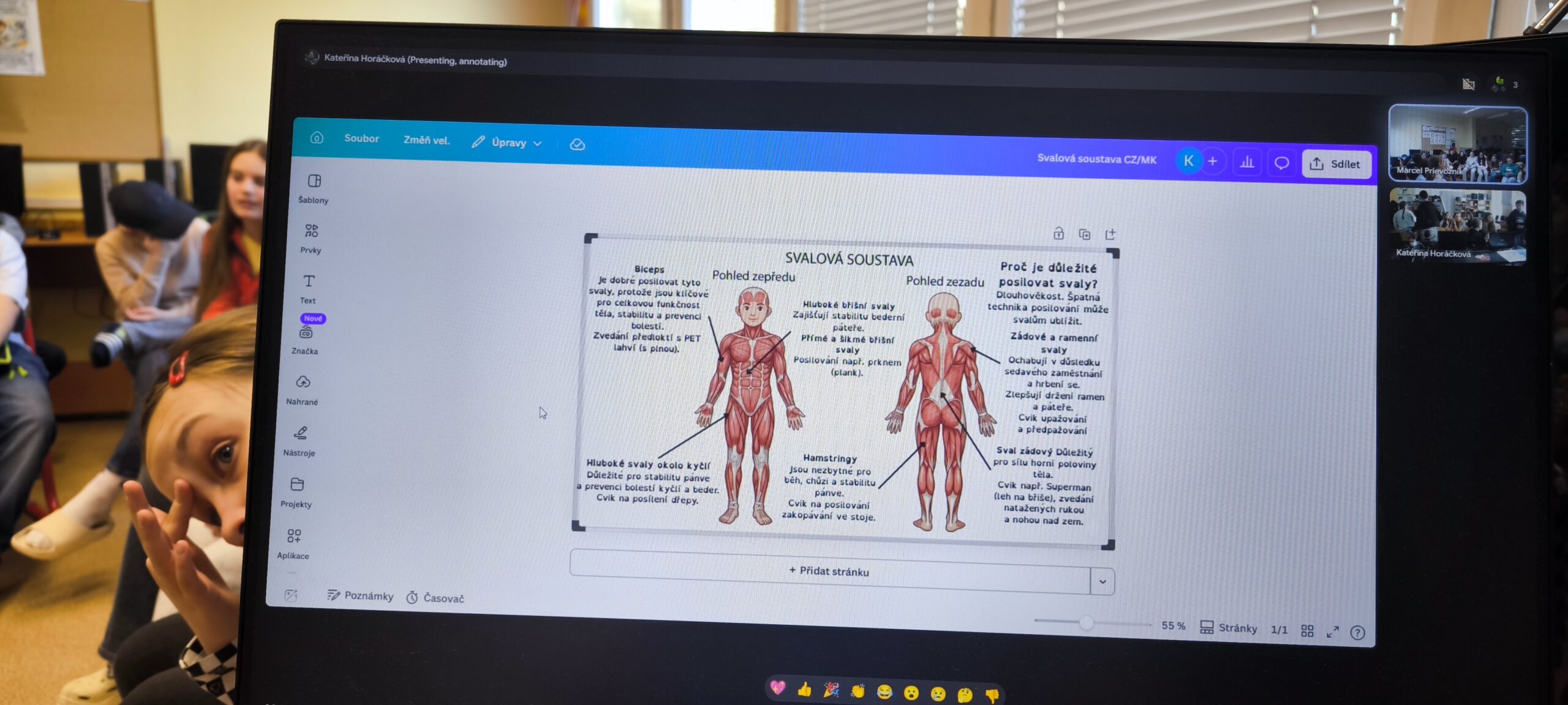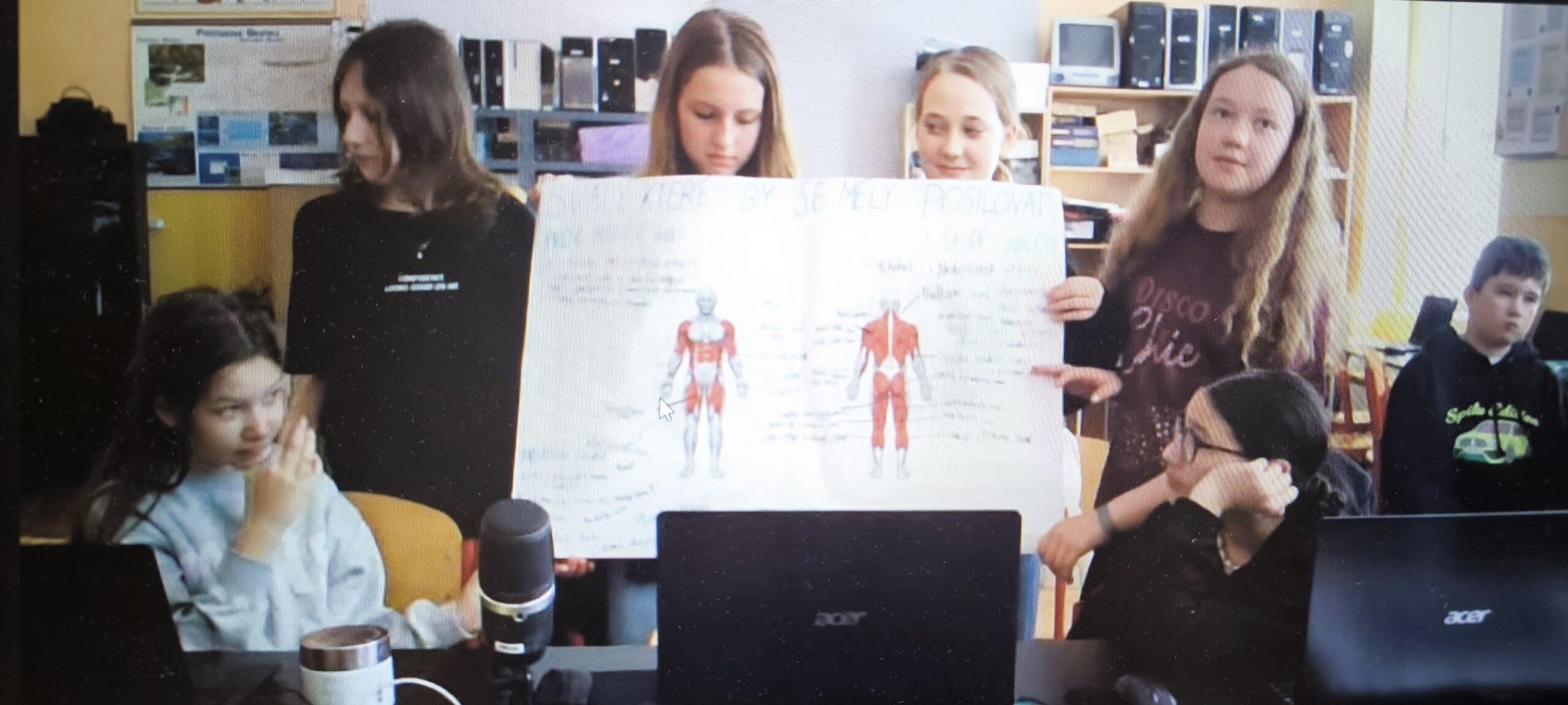 Spoločne si prešli prekresľovanie kostry, plagáty aj vlastné videá (link na naše videá na Padletelink na naše videá na Padlete) a zároveň si nastavili úlohy do ďalšieho stretnutia. V najbližšom období sa budú venovať meraniu tepu a dychu, tvorbe príbehu o putovaní krvinky telom a vyskúšajú si aj pohybové aktivity pripravené partnerskou školou.