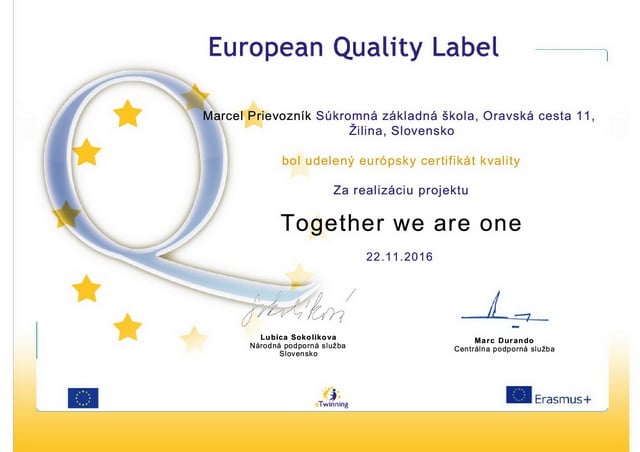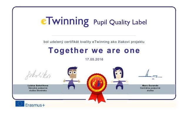 Naši žiaci to zas a znova dokázali. Získali európsky certifikát kvality za prácu v eTwinning projekte Together We Are One, ktorý realizujeme so školou Pillgwenlly Primary vo Walese. Gratulujeme a ďakujeme za úspešnú reprezentáciu školy. Znamená to, že ich práca bola ocenená na najvyššej európskej úrovni.