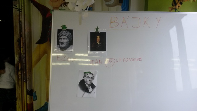 Tieto aj podobné mravné ponaučenia sme počúvali my – tretiaci (ježkovia a lienky) v krajskej knižnici. Naša vždy pozitívne naladená pani Ďuračíková nám prezentovala bájky. Už sme vedeli, že sa v nich zvyknú vyskytovať zvieracie postavy, že majú ľudské vlastnosti, že na záver je nejaké poučenie. Ale fotografie známych bájkarov a ich životné útrapy sme veru nepoznali. Tretiakov zaujal smutný osud Ezopa, ťažkosti Jeana De La Fontaineho či Alexandra Krylova. Dokonca aj ich portréty zaujali. Spoločne sme si prečítali dve Ezopove bájky o zvieratách. Deti mohli prejaviť svoje tvorivé vlastnosti v dopisovaní komiksu o Zajacovi a korytnačke. Dokonca na záver sme si jednu bájku aj pozreli. Samozrejme, deťom sa veľmi páčilo. Tak ako vždy. Ďakujeme 🙂