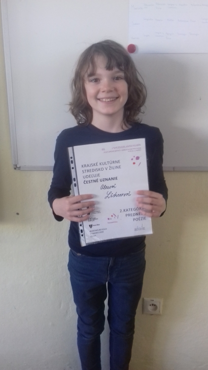 Srdečne blahoželáme Alexovi Lichnerovi za zisk čestného uznania v 2. kategórii – poézia na okresnom kole recitačnej súťaže Hviezdoslav Kubín.