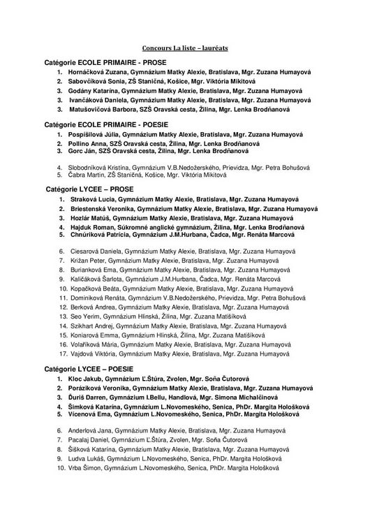Aj tento rok sa ôsmaci- francúzštinári zapojili do celoslovenskej súťaže v písaní poézie a prózy, ktorej témou bol La liste- Zoznam. Ich úsilie a kreativita, jazykové schopnosti boli aj tentoraz ocenené. Barbora Matušovičová z VIII.EB získala 3.miesto v kategórii Základné školy- próza, Anna Pollino z VIII.EB získala 2.miesto v kategórii Základné školy- poézia a Ján Gorc z VIII.EA získal pekné 3.miesto v kategórii Základné školy- poézia. Všetkým gratulujeme a prajeme im, nech ich francúzština aj naďalej baví.
