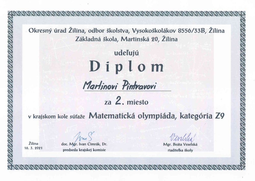 Náš žiak 9.ročníka Martin Pintrava sa 16.03.2021 zúčastnil krajského kola Matematickej olympiády. 70.ročník súťaže prebiehal online formou. V kategórii Z9 sa Martin umiestnil na úžasnom 2.mieste. K vynikajúcemu výkonu mu srdečne gratulujeme a želáme mu veľa úspechov aj do budúcnosti.