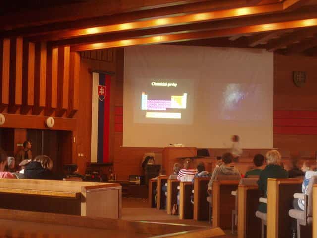 Dnešný deň sme sa vybrali do mesta, aby sme si vypočuli prednášku, ktorú pravidelne usporadúva nezisková organizácia Pansophia. V plnej sále Mestského úradu v Žiline si mnoho žiakov vypočulo rôzne zaujímavosti o tom, čo je atóm, ako vznikla chémia, ako funguje príroda z pohľadu chémie, ale i zo života osobností chémie.