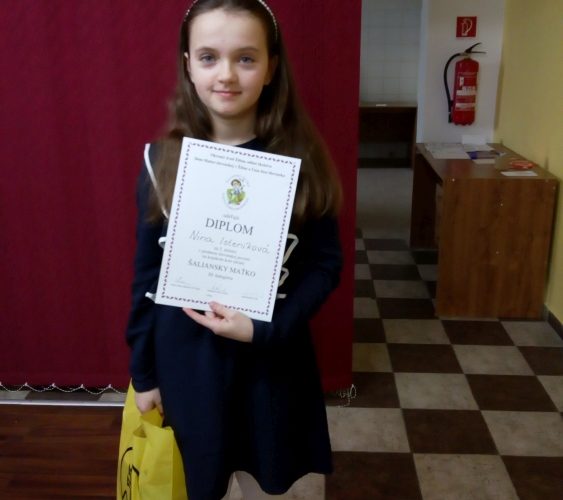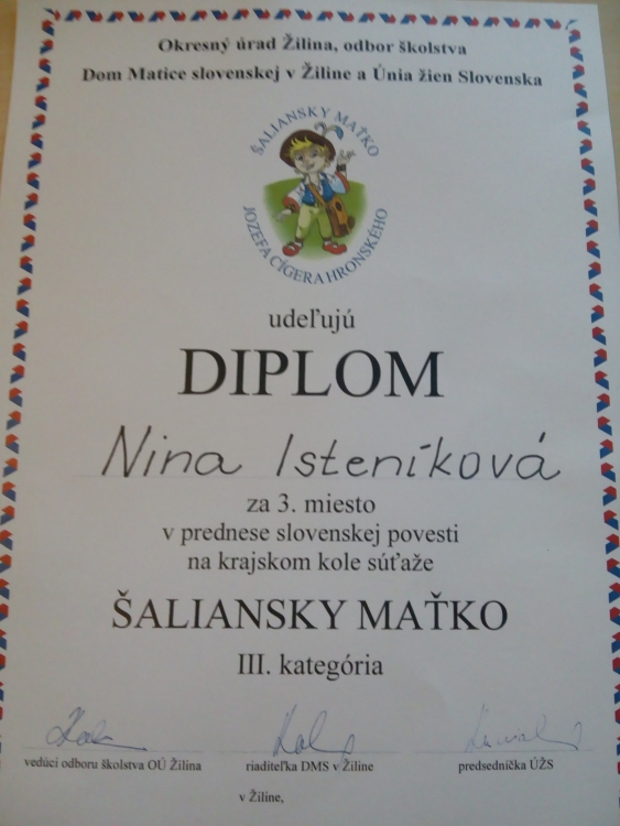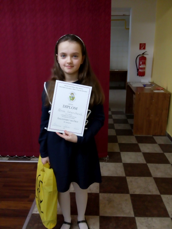 Dom Matice slovenskej v Žiline sa v piatok niesol v duchu krásy umeleckých prednesov slovenských povestí. Víťazi okresných kôl sa snažili zaujať svojimi recitátorskými výkonmi divákov i porotu.Našu školu úspešne reprezentovala Ninka Isteníková, VII.SVB, ktorá s povesťou Smolenický zámok získala v tretej kategórii nádherné 3. miesto.