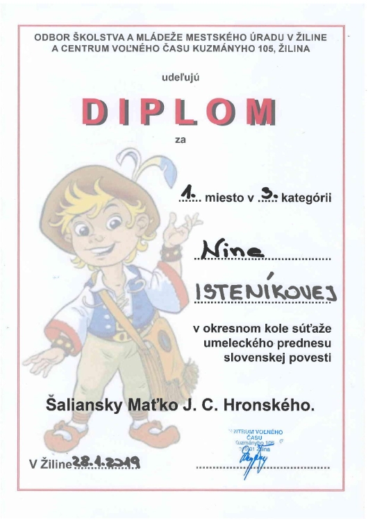 S čarom zábavných či tajomných povestí sme sa stretli na okresnom kole súťaže v prednese povestí Šaliansky Maťko, ktoré bolo plné výborných recitátorov. Ako to už však býva, víťaz môže byť len jeden. Porota to mala opäť ťažké. Spomedzi množstva výborných prednesov vybrať ten najlepší nie je jednoduché a častokrát o víťazstve rozhodujú maličkosti. Naši recitátori nás reprezentovali vynikajúco. Pre Alexa Lichnera z III.LN to bola recitátorská premiéra a pre ostrieľanú recitátorku Ninu Isteníkovú zo VII.SVB ďalšia skúsenosť. A úspešná! Ninka sa umiestnila v III. kategórii na 1. mieste a postupuje do krajského kola.