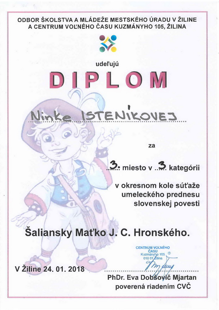 Už každoročne sa najlepší recitátori, víťazi školských kôl, stretávajú na prehliadke prednesov slovenskej povesti. Teší nás, že v silnej konkurencii 19 recitátorov sa na okresnom kole nestratila naša žiačka Ninka Isteníková zo VI.SB. Svojím presvedčivým výkonom oslovila divákov i porotu. K získaniu 3. miesta jej srdečne blahoželáme.