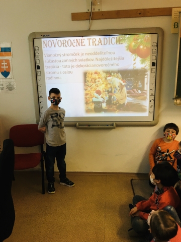 Náš šikovný žiak Mark Kurakin z Delfínkov si pre spolužiakov pripravil krásnu prezentáciu a porozprával aké majú v Rusku zvyky a tradície. Najdôležitejšou súčasťou je dekorácia vianočného stromčeka na ktorej sa vždy podieľa celá rodina. V niektorých rodinách je zvykom maľovať okná a nábytok – na skle alebo zrkadle skrinky znázorňujú symbol budúceho roka a ďalšie zimné obrázky. Na Silvestra sedia všetci spolu pri slávnostnom stole, najskôr odprevadia starý rok, spomenú si ako si ho pamätali alebo čo bolo v ňom to hlavné pre každého z prítomných a navzájom si želajú, aby všetko dobré zo starého roka prešlo do nového. Pre deti to bol veľký zážitok!