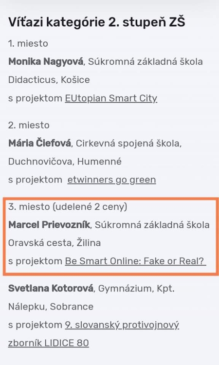 Gratulujeme našim žiakom. Získali sme 3.miesto v celoslovenskej súťaži eTwinning projektov v kategórii 2. stupeň ZŠ. Sme hrdí na Vás. Opäť ste preukázali, že to, čo robíte, je skvelé a hodné pochvaly a ocenenia. Ste úžasní. https://www.etwinning.sk/aktuality/vitazi-narodnej-sutaze-etwinning-2022-75