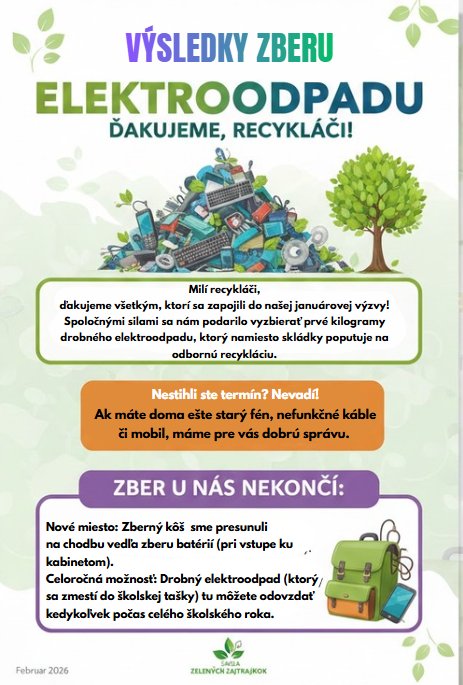 Zber u nás nekončí: Nové miesto: Zberný kôš sme presunuli na chodbu vedľa zberu batérií (pri vstupe ku kabinetom).