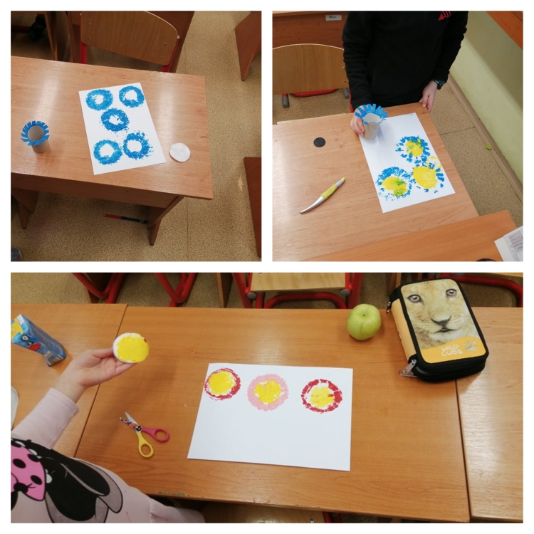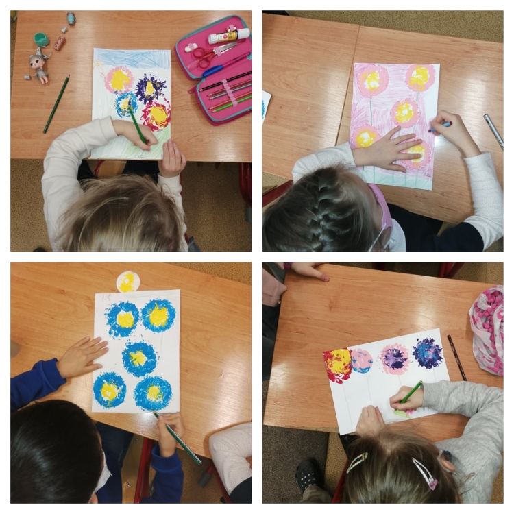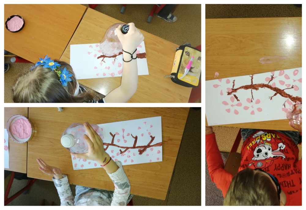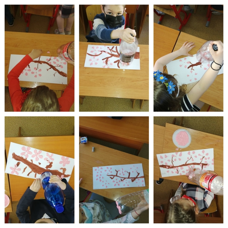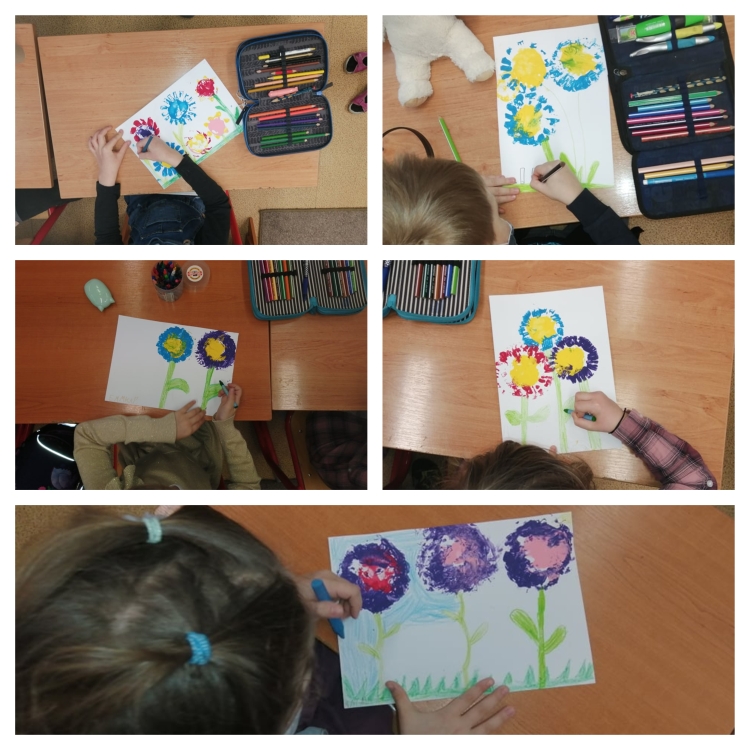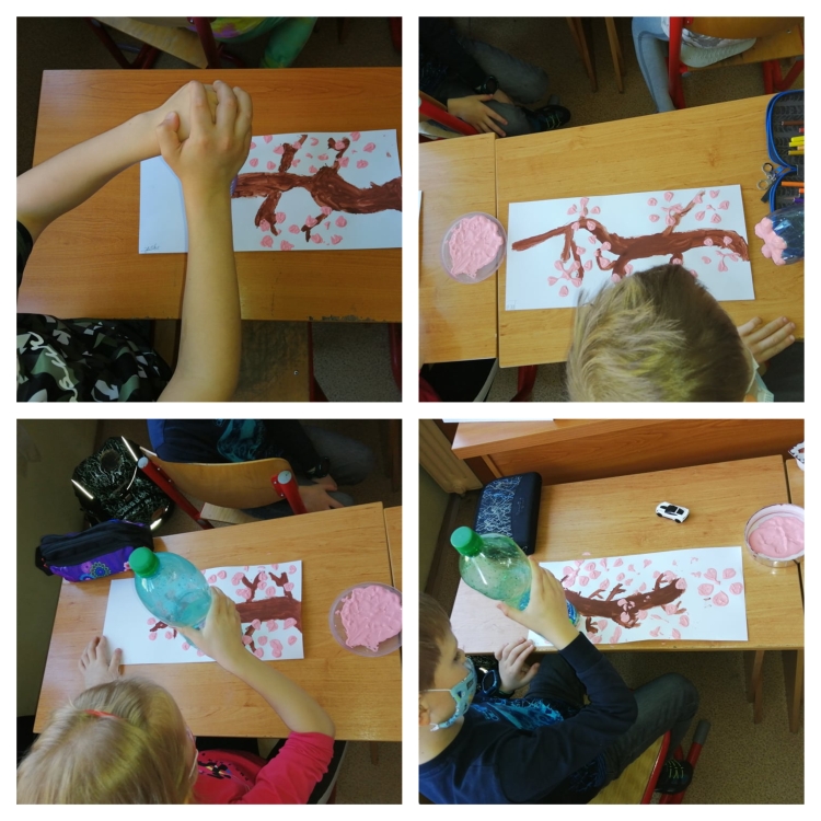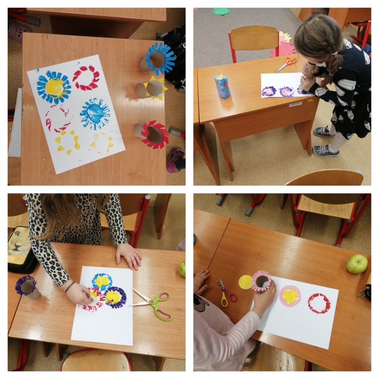 Po návrate do školy prišla vhodná chvíľa sa vyšantiť so školskými výkresmi, na ktorých sme vyjadrili naše potešenie z jarného obdobia tvorbou krásnych kvietkov metódou pečiatkovania.