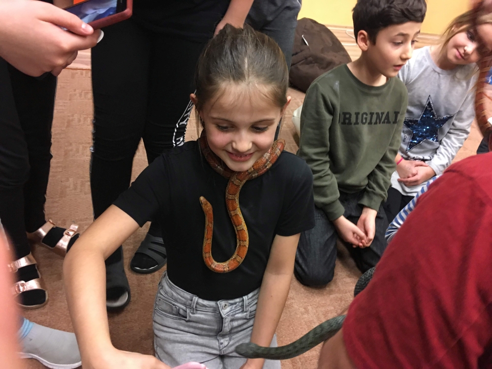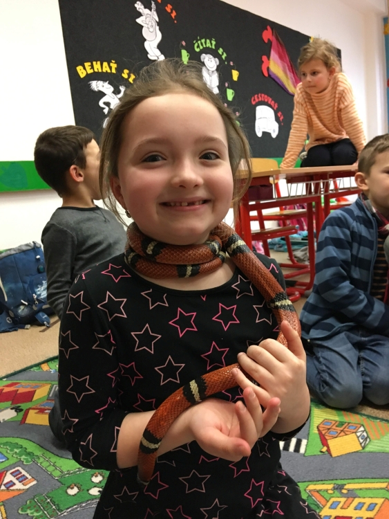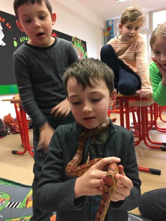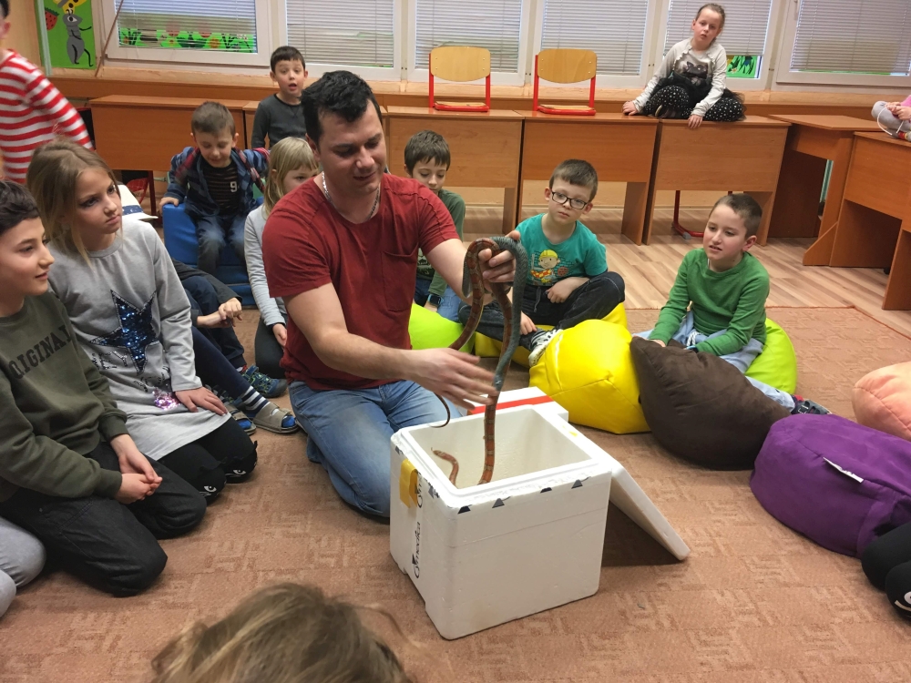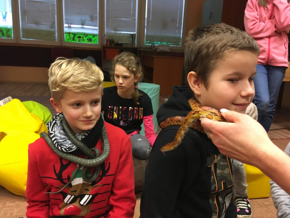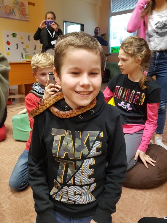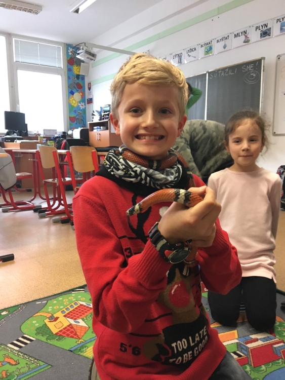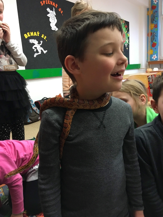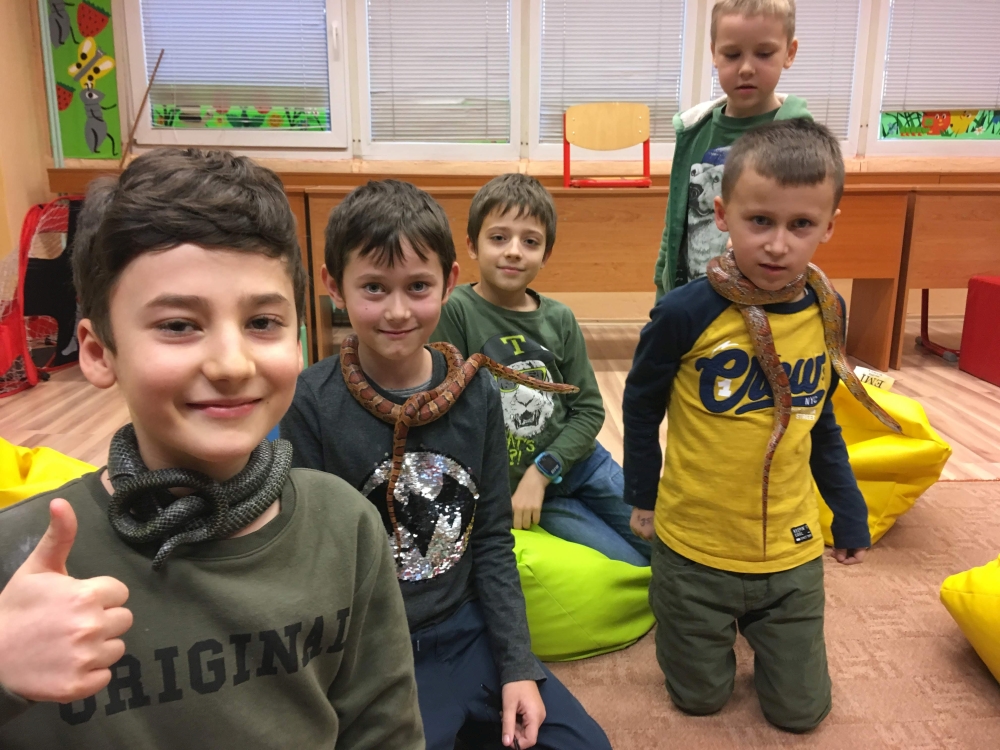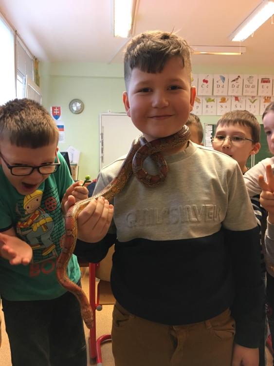 Kto by povedal, že hady, ktorých sa väčšina nás štíti sú také zaujímavé. Zaujímavú prednášku so živým hadom si mohli naše deti vypočuť od nášho p. vychovávateľa Roba Štolfu. Je to expert na chovanie zvierat v zajatí a obohacuje náš klub zážitkovými prednáškami o živočíšnej ríši.