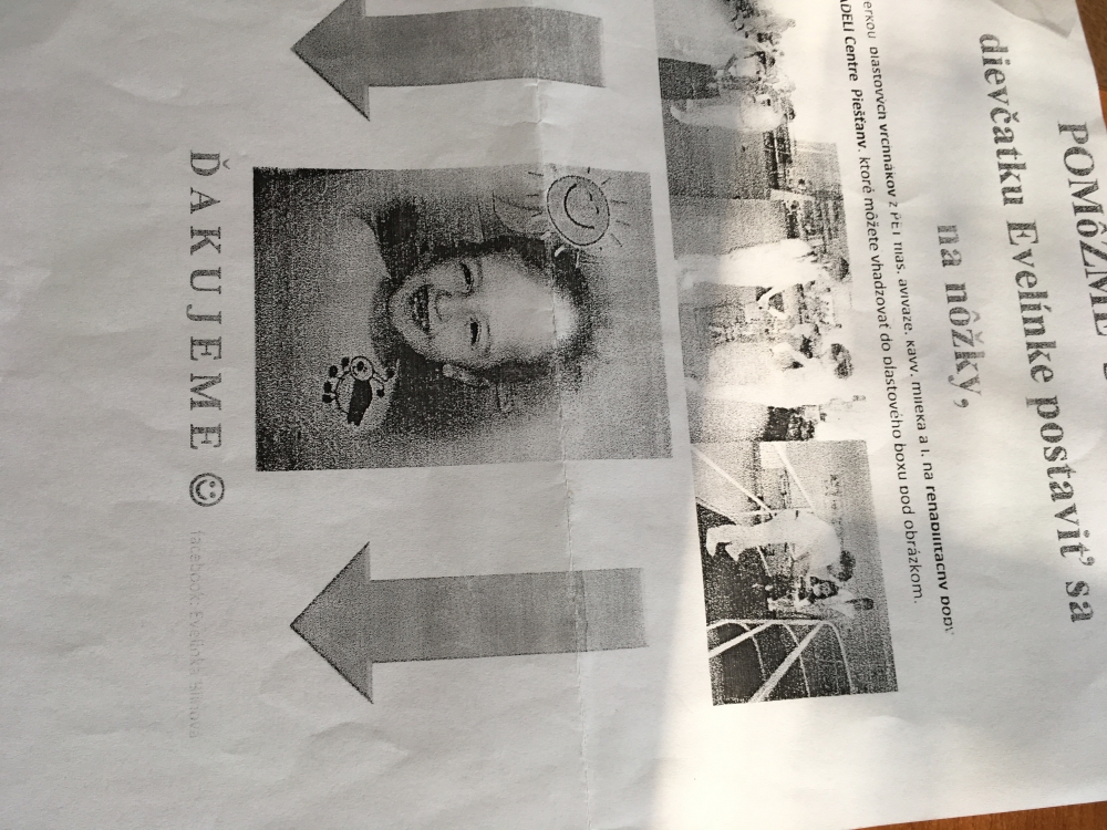 Naši prváčikovia- ježkovia sa zapojili do akcie pomoci pre dievčatko Evelínku. Pre zdravotné problémy nemôže chodiť. Pomohli by jej kúpeľné rehabilitačné pobyty v Piešťanoch, ktoré sú ale finančne pre rodinu náročné. Zbierkou plastových vrchnákov, ktoré sú vstupenkou na tieto rehabilitačné pobyty, pomôžu deti nie len Evelínke, ale aj našej prírode.