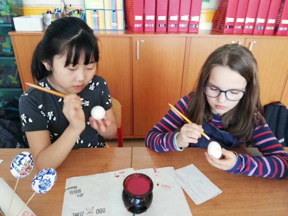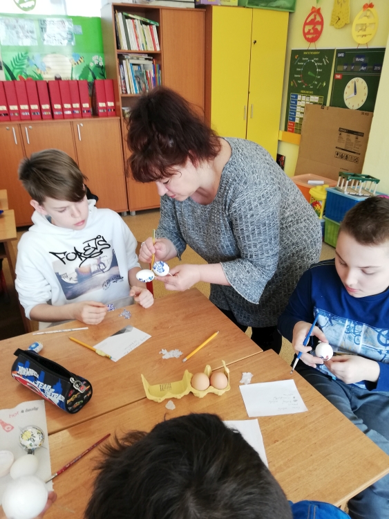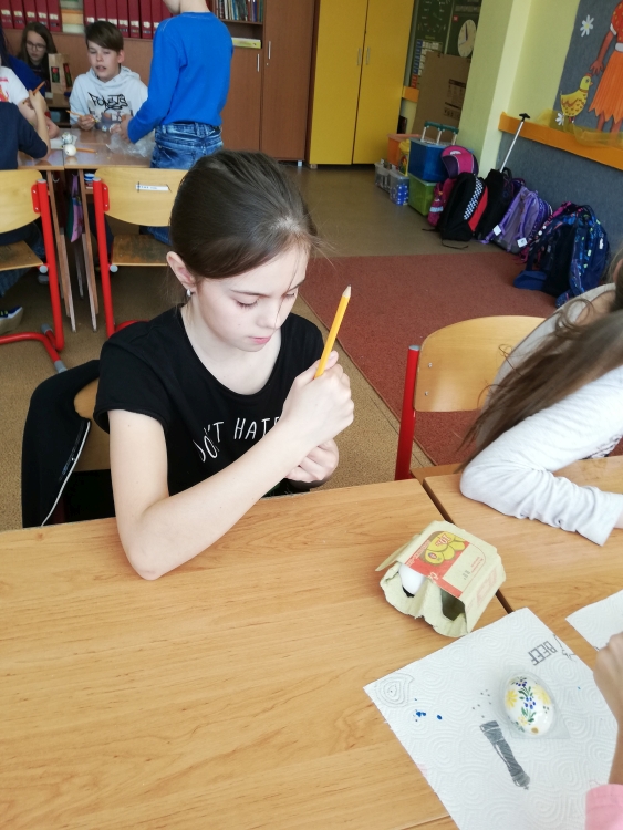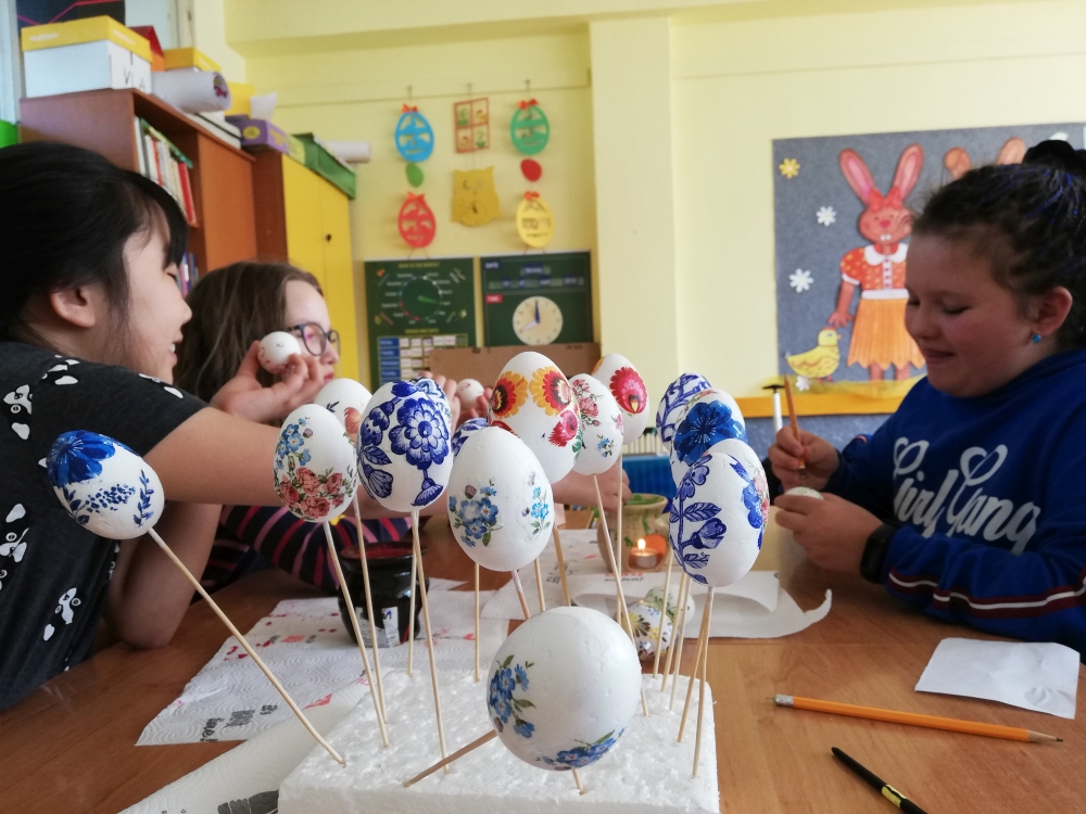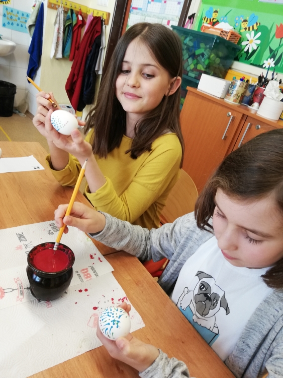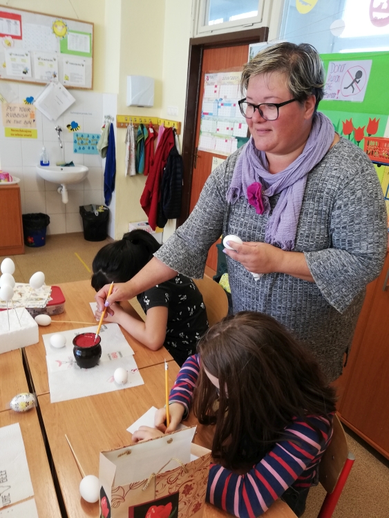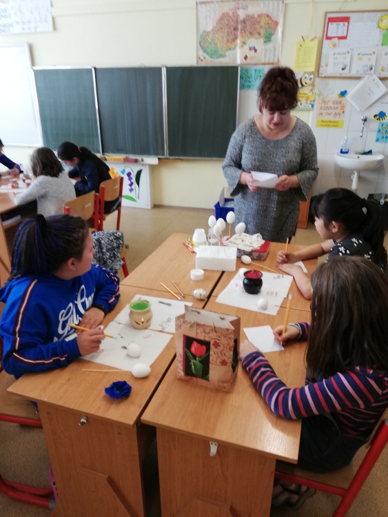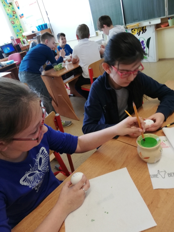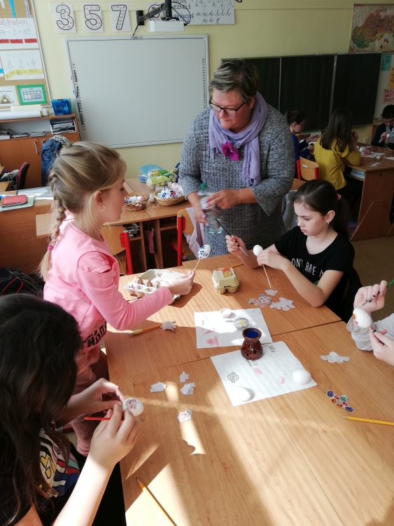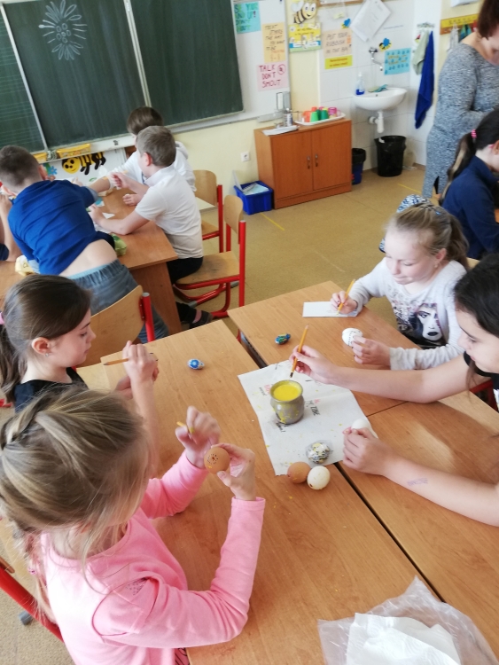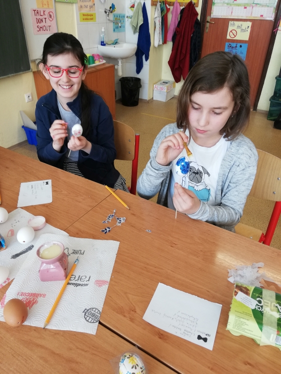 Ešte pred veľkonočnými sviatkami si stihli usilovné Včielky pripraviť a hlavne vyskúšať 2 techniky zdobenia kraslíc. Veľkonočnú atmosféru a najmä praktické rady nám sprostredkovala mamina našej spolužiačky p. Gašpieriková spolu s jej šikovnou priateľkou. Jednoduchšou a efektnejšou technikou bolo “servítkovanie”. Zaujímavejšou ale náročnejšou bolo “voskovanie”. Každý sa musel popasovať so svojou zručnosťou, trpezlivosťou a fantáziou. Výsledkom boli originálne kraslice.