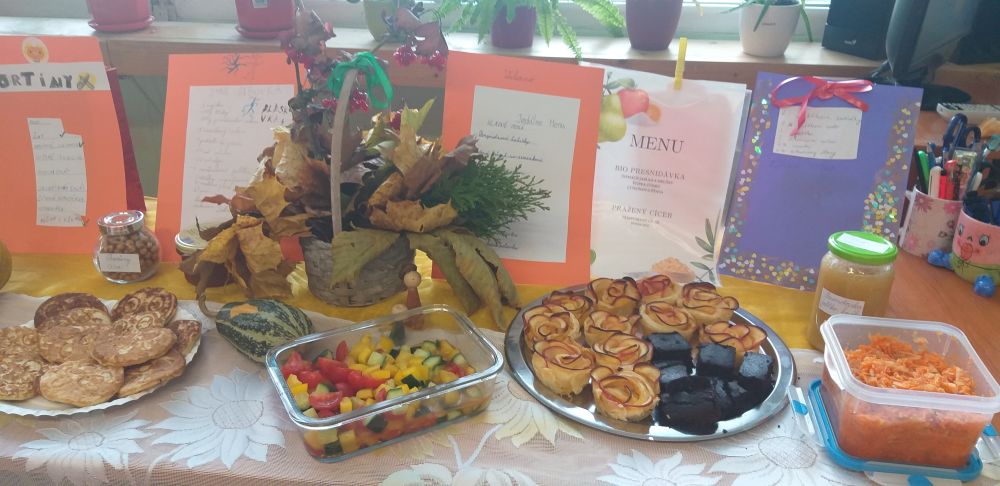 Okrem zeleninky sme si pochutnávali aj na výborných lievancoch, skvelej bábovke, servíroval sa zeleninový a ovocný šalátik, pražený cícer, bio presnidávka, jablkové ružičky, zdravý koláč, ktorý mal názov: Čokoládový koláč bez výčitiek a v ponuke bol aj syr s bylinkami, plnené rožteky, zdravé džemy a ovocné čajíky, no proste, všetko bolo mňam, mňam…